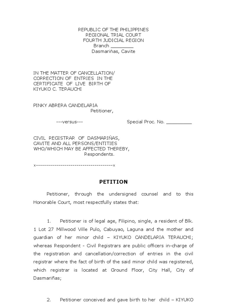 You'll get this at your local civil registrar. Template sample > templates > sample petition forms signatures. Petition for adoption sample format philippines. Modify and reprint your package as many times as you like. Petition for bail for non bailable offense. Free 23 sample petition templates in pdf | ms word. A good command over the language is also necessary when drafting a petition letter. In the philippines, spouses have the duties to live together, observe mutual love, respect and fidelity, and render mutual help and support and these are embodied under the family code of the philippines. (1) repeated physical violence or grossly abusive conduct directed against the petitioner, a. Republic of the philippinesregional trial courtnational capital judicial regionbranch 104, quezon cityin re: A petition under article 139a(2) of the constitution and/or section 25 of the code filed under order xli of the rules shall state succinctly and clearly all relevant facts and particulars of the case and the grounds on which the transfer is sought supported by an affidavit. Petition for custody sample philippines. Transfer petition format in supreme court.
