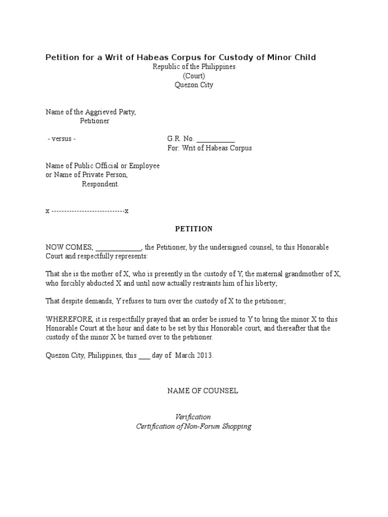 If you're in the philippines, online application is likewise the best option although you can also request no clue about the special power of attorney and its format? Petition for custody sample philippines. Sample petition to make special for a uspto trademark applicationfull description. Cause number plaintiff's original petition. Some petitioners get worried about leaving spaces blank, or ask what do i write if it doesn't apply to me?. Here are a free template and everything. However, with some smart planning, you can easily make your petition look like it has been created by experts and legal letter formats what. The necessary format should be followed which is the cause title, name of court, memo of parties, index, etc.(look into the applicable state rules as various states have certain additional requirements. The address of the authority to whom request is made, the body that briefly states the problem, unfairness or injustice along with other relevant background information showing the importance of what you are fighting for and at. Republic of the philippines 1. Application for bail bail petition bail petition format petition for bail. Legal templates, list templates, log & schedule templates. A collection of petition samples for a variety of purposes, from divorce petitions to university petitions, with useful guidelines in writing your own petition.